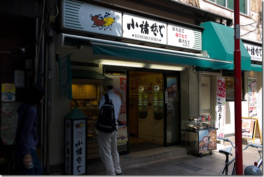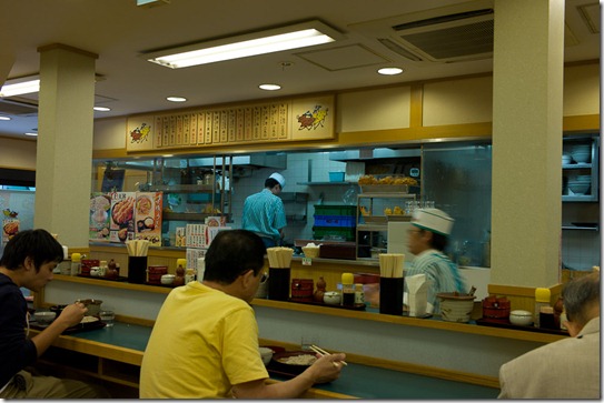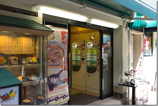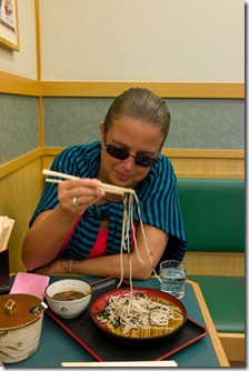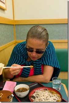 Hin zum Soba-Restaurant (Buchweizennudeln), wo man am Automaten (im Bild rechts) bezahlt, was man sich links auf den Bildern ausgesucht hat… Dann innen alles frisch zubereitet und gegessen. Da kann man bei 3 € für Nudeln mit Rettich aber wirklich nichts sagen!