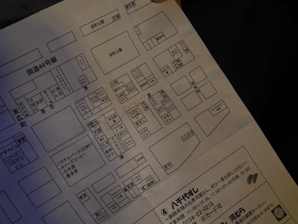 Manchmal bekommt man aber auch auf Rückfrage (wenn einen jemand versteht…) Empfehlungen wie das oben in der Karte handschriftlich eingetragene “KURABAR”. Das sucht man dann, und sucht, und sucht… Schließlich fällt einem auf, dass, wenn man “Crabber” als Japaner zu Hiragana (was meist für lateinische Zeichen ausländischer Namen zur Transkription verwendet wird) wandelt und dann zurück nach “Romanji” (so heißt lateinische Schrift auf Japanisch), dann kommt dann eben “Kurabar” heraus – so wird auch Englisch gesprochen… Mit diesem Wissen findet man dann das Restaurant recht schnell