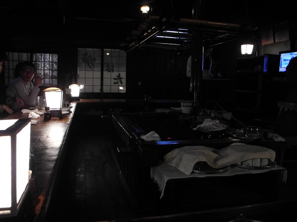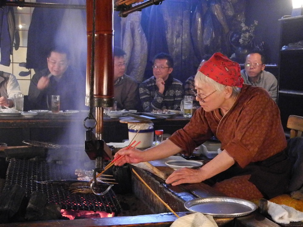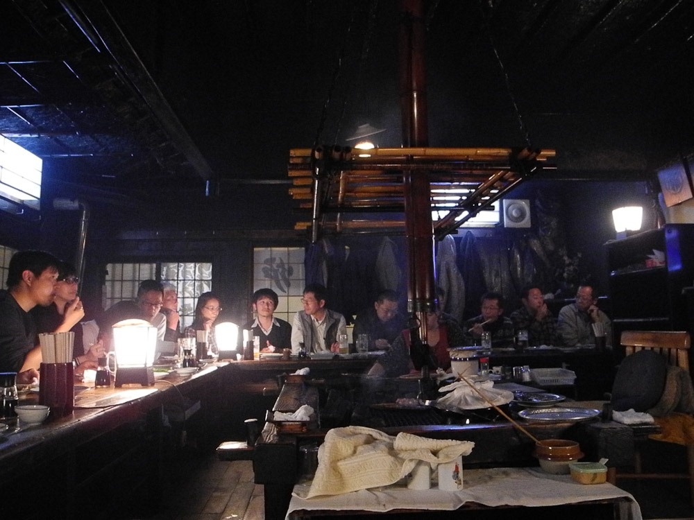 Alle sitzen rund um den Grill (das ist dann eine Robataya)