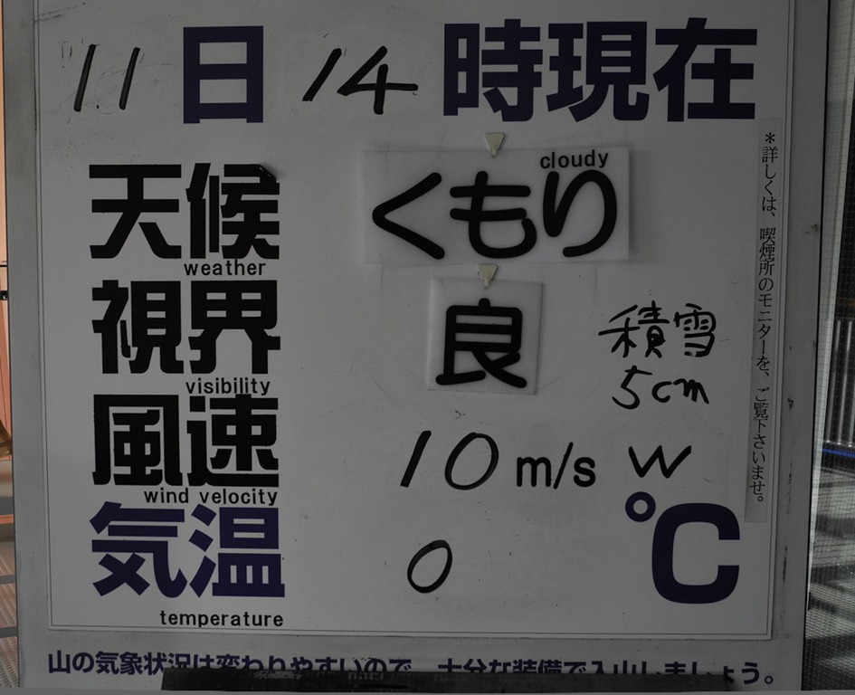 Die Sicht und das Wetter unten waren zwar nicht allzu gut – aber bei dem Zeichen haben wir dann doch überlegt, ob das Sinn macht. Aber man meinte oben sei es ok – wechselhaft eben, da haben wir es dann versucht… Besonders spannend war dabei auch die Weitsicht von 5 cm – aber das haben wir dann als “Schneehöhe” interpretiert ![]()