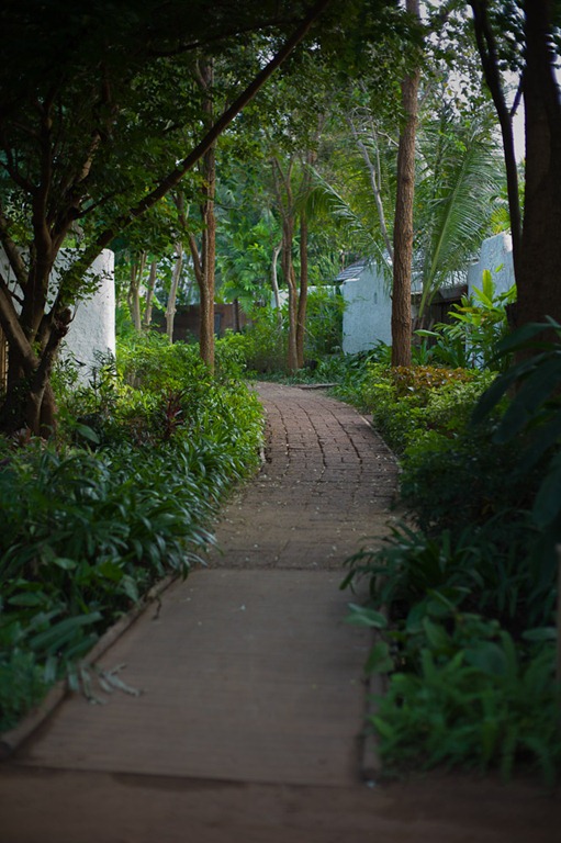 Das Hotel ist prinzipiell zweigeteilt – eine Seite mit den Bungalows und eine mit klassischem Hotel – alles aber in einer alten, umgewandelten Kokosnuss-Plantage, daher auch die schnurgeraden Reihen der Pflanzen, welche nun schön mit alten Steinen und gebrauchtem Holz (Schwemmholz, Eisenbahnschwellen, alte Hausteile, etc.) auf- und ausgebaut wurden.