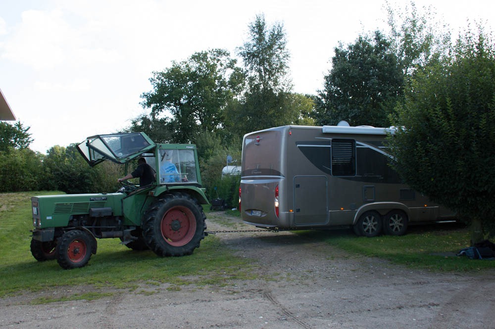 Bevor es mit den Inhalten losgeht erst einmal aber noch ein redaktioneller Beitrag: “wie bekommt man einen fest steckenden Camper aus einer matschigen Wiese?”. Richtig – mit einem Traktor… Schon klasse, was die Dinger so wegziehen ![]()