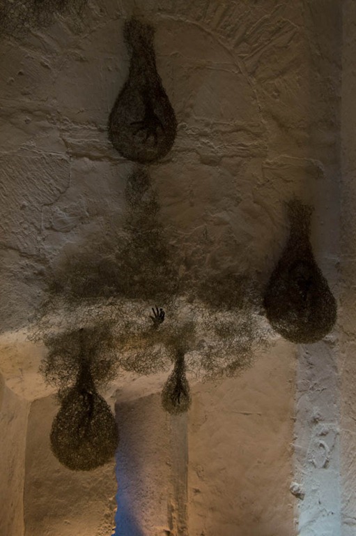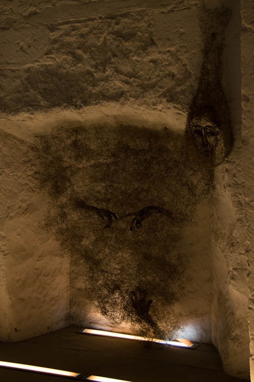 Eine ganz andere Installation dann im Wehrturm. Hier waren früher in dem kleinen Raum bis zu 60 Gefangene versammelt und der Künstler hat versucht diese Enge und Not auszudrücken