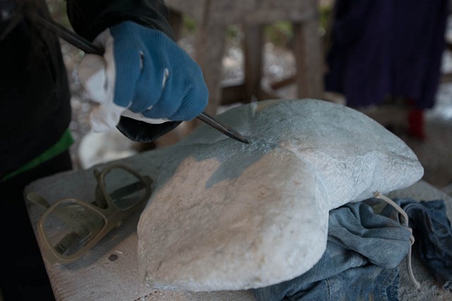 Nachdem dann der Stein gefunden und die Flusshaut an den wichtigen Stellen entfernt wurde (so echt mit Hammer und Meißel), entsteht nach 2-3 harten, zähen Tagen mit viel Muskelkater und Gelenkschmerzen schon ein tolles Kunstwerk!